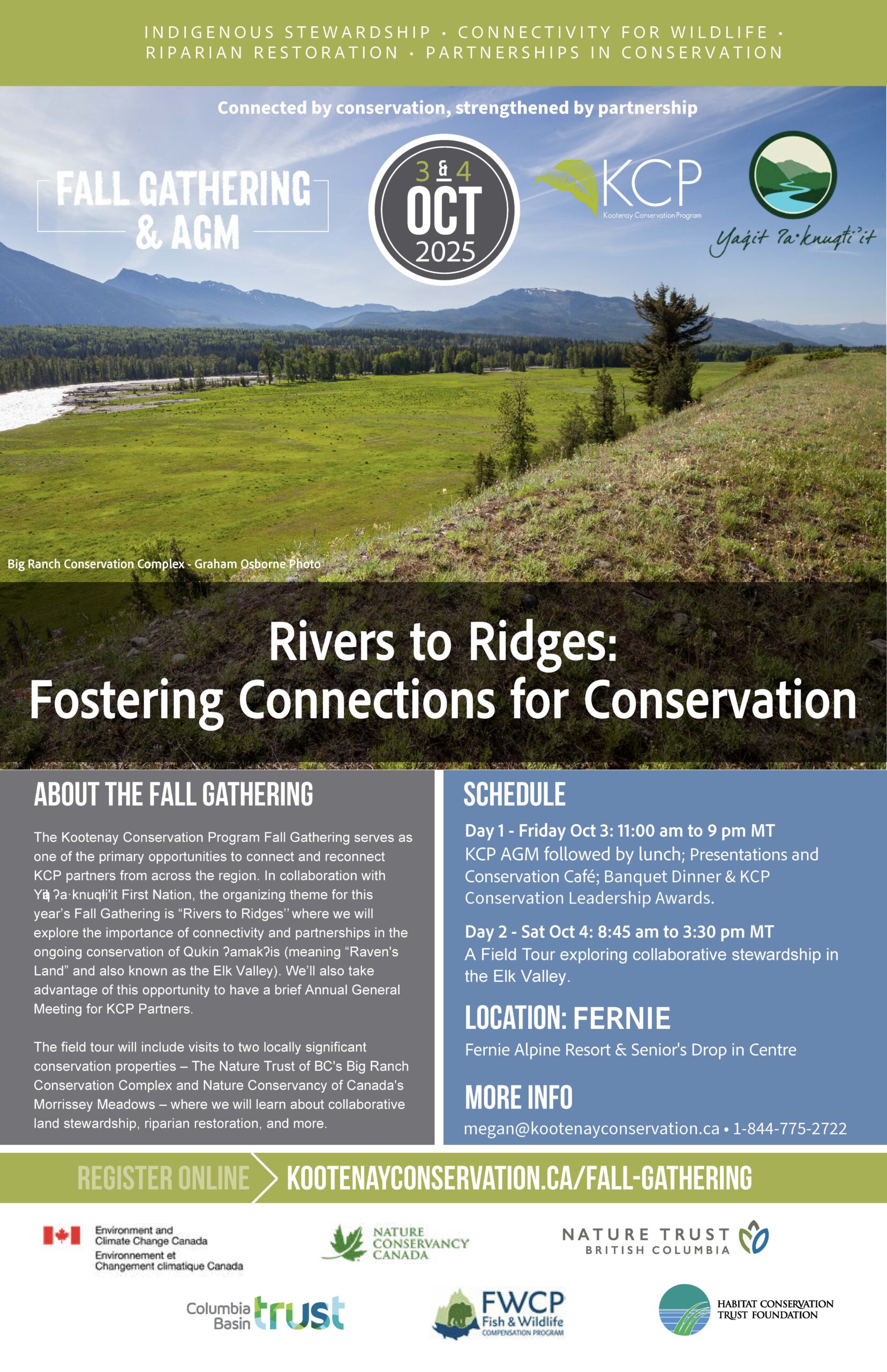 During the 2-day event on October 3 & 4 in Fernie, Kootenay Conservation Program (KCP) highlighted the power of partnerships and collaboration in the ongoing conservation of Qukin ʔamakʔis, meaning “Raven’s Land” and also known as the Elk Valley. This biodiverse valley provided us with an opportunity to explore the importance of connectivity – from rivers to ridges – and the deep cultural and ecological values of the landscape.